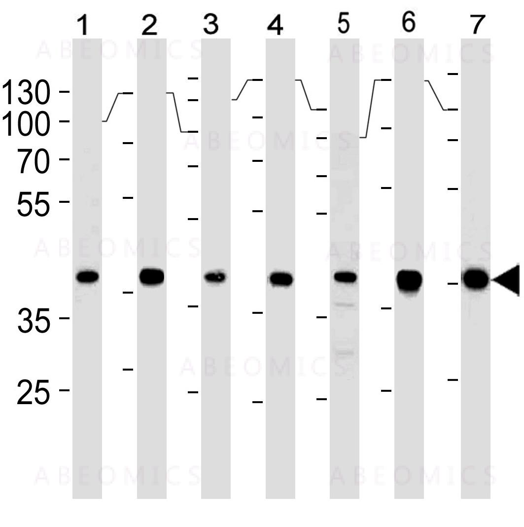Figure 1: Western blot analysis of MAPK1 Antibody (10-6593) with Lane 1: MCF-7, Lane 2: HepG2, Lane 3: NCI-H292, Lane 4: Hela, Lane 5: mouse NIH/3T3, Lane 6: Neuro-2a, Lane 7: rat C6 cell line lysates (35μg/lane). This demonstrates the MAPK1 antibody detected the MAPK1 protein.