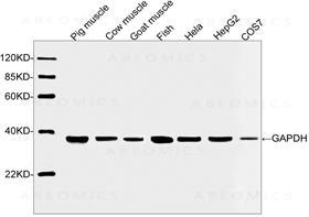 Figure-1 : Western blot analysis of GAPDH Antibody (Clone: 3B1E9 ) at 1 µg/ml on Pig muscle, Cow muscle, Goat muscle, Fish (tissue lysates) and HeLa, HepG2, COS7 cell lysates.