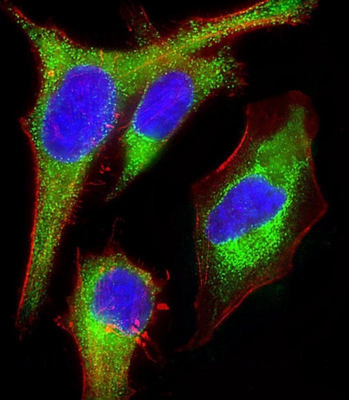 Figure 1: Immunofluorescent analysis of 4% paraformaldehyde-fixed HeLa (human cervical epithelial adenocarcinoma cell line) cells labeling Pdx1 with GPR56 antibody (10-6625) at 1/25 dilution, followed by Dylight® 488-conjugated goat anti-rabbit IgG secondary antibody at 1/200 dilution (green). Immunofluorescence image showing Cytoplasm staining on Hela cell line. Cytoplasmic actin is detected with Dylight® 554 Phalloidin at 1/100 dilution (red). The nuclear counter stain is DAPI (blue).