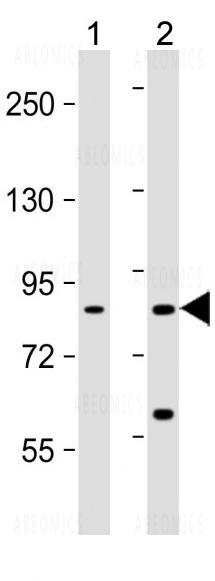Figure 1: All lanes : Anti-Human HGF (10-6577) at 1:1000 dilution with Lane 1: HepG2 whole cell lysate and Lane 2: Ramos whole cell lysates/proteins at 20 µg per lane. Secondary Goat Anti-mouse IgG, (H+L), Peroxidase conjugated at 1/10000 dilution. Predicted band size : 83 kDa.