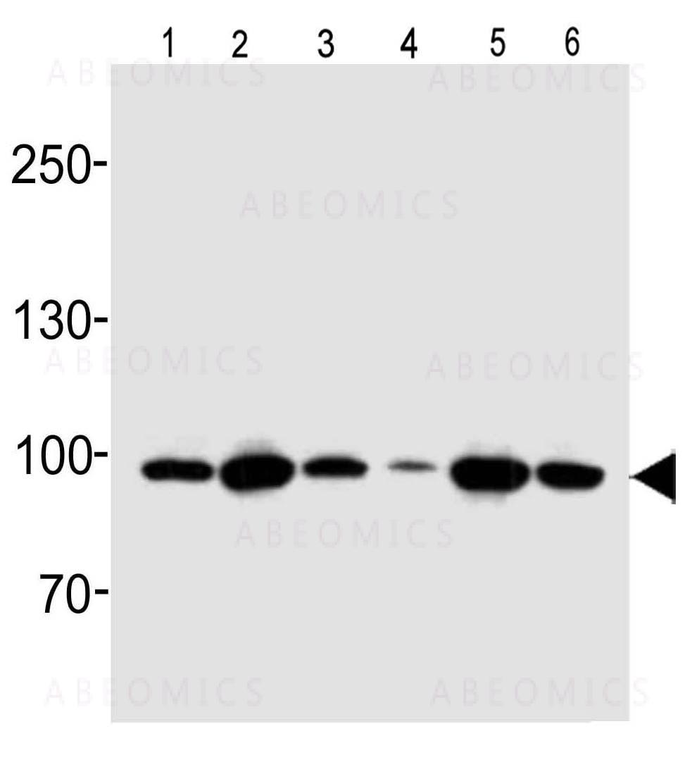 Figure 1: Western blot analysis of Hsp90 Antibody (10-6621) with lysates Lane 1: Hela, Lane 2: K562, Lane 3: HepG2, Lane 4: mouse NIH/3T3, Lane 5: A2058, Lane 6: T47D cell line. Hsp90 Antibody was diluted at 1:1000 at each lane. A goat anti-mouse IgG H& L(HRP) at 1:10000 dilution was used as the secondary antibody. Lysates at 20μg per lane.