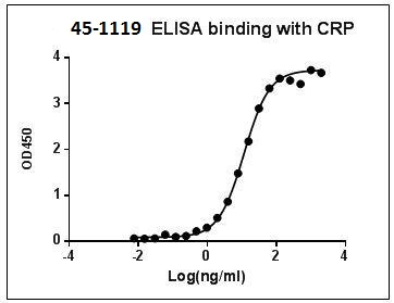 Figure-1 : ELISA binding of CRP Antibody ( Clone: 39E5) with Human CRP, Coating antigen: Human CRP at 1 µg/ml, Human CRP antibody dilution start from 2000 ng/ml, EC50=11.58 ng/ml.