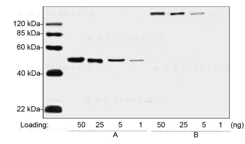 Figure-1 : Western blot analysis of IgG (Fc) Antibody (Clone: 27B11E9) on (A) human Fc-tagged protein and(B) human IgG. IRDye 800 Conjugated affinity Purified Goat Anti-Mouse IgG was used as secondary antibody.