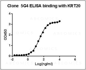 Figure-1 : ELISA binding of KRT20 Antibody (Clone: 5G4) with Human KRT20 recombinant protein, Coating antigen: KRT20 at 1 µg/ml, KRT20 antibody dilutions start from 1000 ng/ml, EC50= 28.85 ng/ml.
