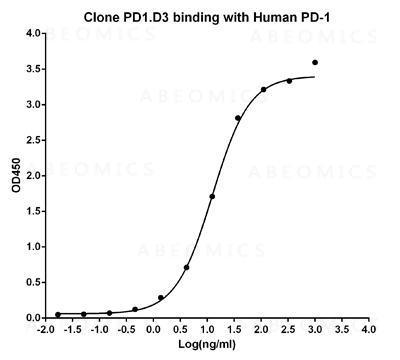 Figure-1 : ELISA binding of human PD-1 antibody (Clone: PD1.D3) with Human PD-1 recombinant protein. Coating antigen: PD-1-Fc, 1µg/ml. PD-1 antibody dilution start from 1000ng/ml, EC50= 12.5 ng/ml.