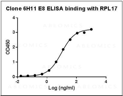 Figure-1 : ELISA binding of RPL17 Antibody (Clone: 6H11E8) with Human RPL17 recombinant protein, Coating antigen: RPL17 at 1 µg/ml, RPL17 antibody dilution start from 1000 ng/ml, EC50= 8.766 ng/ml