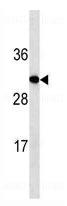 Figure 1:Western blot analysis of IGF2 Antibody (10-6579) in A549 cell line lysates (35μg/lane). This demonstrates the IGF2 antibody detected the IGF2 protein.