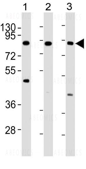 Figure 1: All lanes : Anti-IKK beta Antibody (10-6609) at 1:4000 dilution with Lane 1: HL-60 whole cell lysates, Lane 2: Hela whole cell lysates, Lane 3: Jurkat whole cell lysates/proteins at 20 µg per lane. Secondary Goat Anti-Rabbit IgG, (H+L), Peroxidase conjugated at 1/10000 dilution. Predicted band size : 87 kDa.
