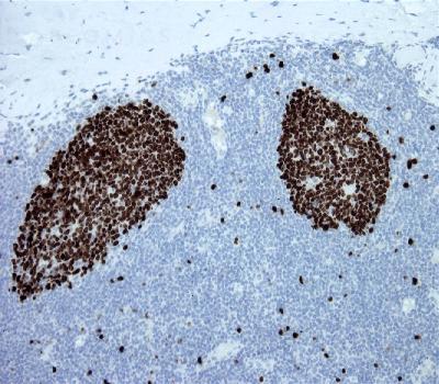 Figure-1: Tonsil section has been stained using Ki67 antibody (Clone: BS4) with 1:200 dilution. Majority of the germinal center B cells have strong nuclear label.