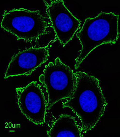 Figure 1: Immunofluorescent analysis of U251 cells, using KIT Antibody (10-6586). KIT Antibody was diluted at 1:100 dilution. Dylight Fluor 488-conjugated goat anti-mouse lgG at 1:400 dilution was used as the secondary antibody (green). Cytoplasmic actin was counterstained with Dylight Fluor® 554 (red) conjugated Phalloidin (red).