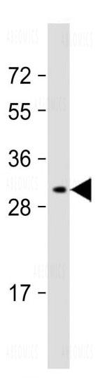 Figure 1: Anti-LXN Antibody (10-6548) at 1:1000 dilution + MCF-7 whole cell lysates/proteins at 20 µg per lane. SecondaryGoat Anti-mouse IgG, (H+L), Peroxidase conjugated at 1/10000 dilution. Predicted band size : 26 kDa.