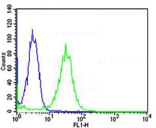 Figure 1: Flow cytometric analysis of Hela cells using MAFK Antibody (green) (10-6616) compared to an isotype control of mouse IgG1 (blue). MAFK Antibody was diluted at 1:25 dilution. An Alexa Fluor® 488 goat anti-mouse lgG at 1:400 dilution was used as the secondary antibody.