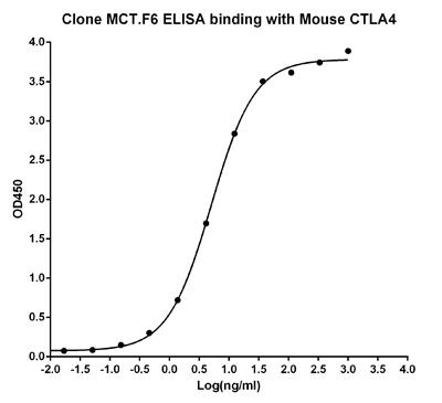 Cytotoxic T-lymphocyte-associated protein 4 (CTLA4), also known as CD152, is one of the first well studied immune checkpoint molecules. CTLA4 is expressed on T cells and its expression level can be up-regulated after T cell activation. CTLA4 has two ligands CD80 (B7-1) and CD86 (B7-2). CTLA4 can compete with CD28 binding with these two ligands and transmits an inhibitory signal to T cells. Therapeutic antibodies against CTLA4 can help to stimulate T cells which can then target many cancer cells. Mouse CTLA-4 antibodies with has blocking effect against CD80/CD86 binding with CTLA4 can serve as a great surrogate antibody in mouse model. Anti-Mouse CTLA-4 Antibody (MCT.F6), mAb, Mouse is produced from the hybridoma resulting from fusion of SP2/0 myeloma and B-lymphocytes obtained from mouse immunized with recombinant mouse CTLA4-Fc