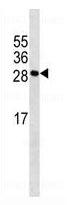 Figure 1: Western blot analysis of MYOG Antibody (10-6563) in mouse heart tissue lysates (35μg/lane). This demonstrates the MYOG antibody detected the MYOG protein.