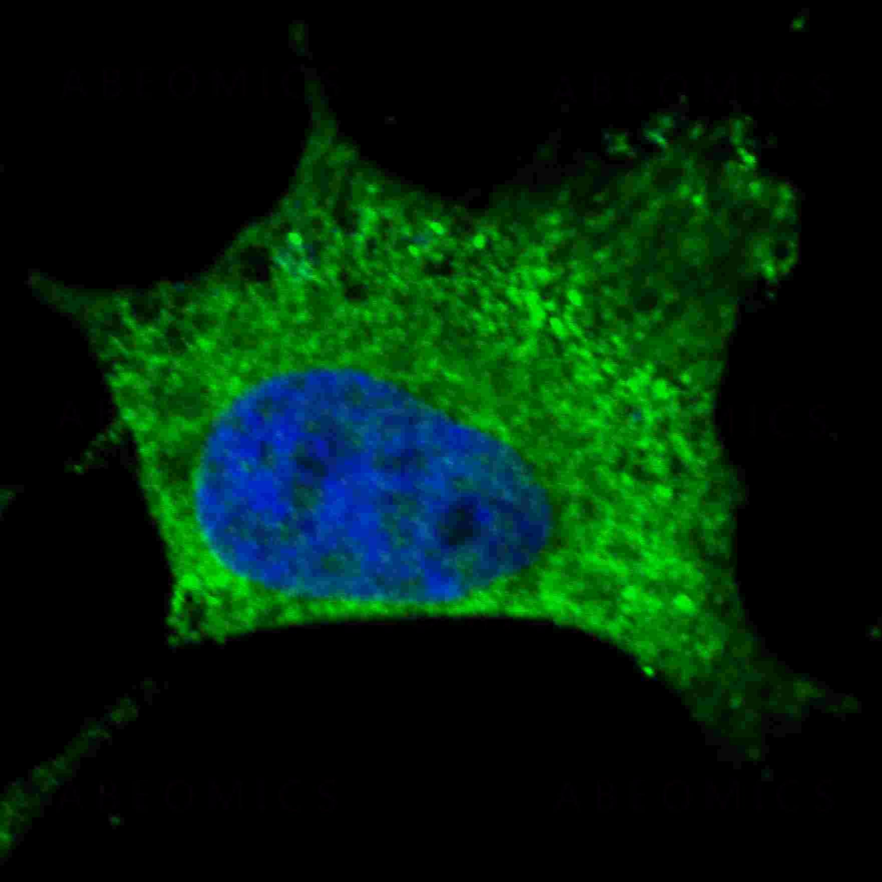Figure 1: Fluorescent confocal image of SY5Y cells stained with NGFR antibody (10-6534). SY5Y cells were fixed with 4% PFA (20 min), permeabilized with Triton X-100 (0.2%, 30 min). Cells were then incubated with NGFR primary antibody (1:100, 2 h at room temperature). For secondary antibody, Alexa Fluor® 488 conjugated donkey anti-mouse antibody (green) was used (1:1000, 1h). Nuclei were counterstained with Hoechst 33342 (blue) (10 μg/ml, 5 min).