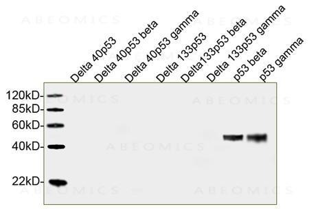 Figure-1 : Western blot analysis of p53 Antibody (Clone: 2D2G6) at 1 µg/ml on human recombinant p53 isoforms (Delta 40p53, Delta 40p53 beta, Delta 40p53 gamma, Delta 133p53, Delta133p53 beta, Delta 133p53 gamma, p53 beta, p53 gamma).