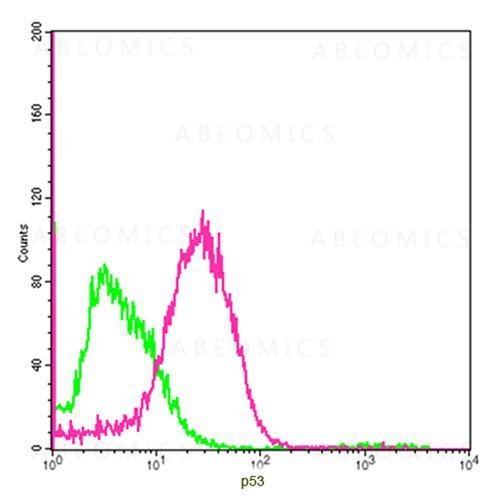 Figure-1 : Flow cytometric analysis of p53 Antibody (Clone: 5H7B9) on HEK293 cells at 2 µg for 1 x 10^6 cells. Red histogram represents p53 Antibody (Clone: 5H7B9) and green histogram represents isotype control.