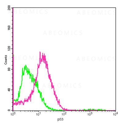 Figure-1 : Flow cytometric analysis of p53 Antibody (Clone: 6F2D3) on HEK293 at 2 µg for 1 x 10^6 cells. Red histogram represents p53 Antibody (Clone: 6F2D3) and green histogram represents isotype control.