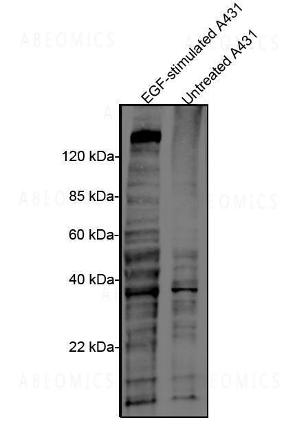 Figure-1 : Western blot analysis of Phosphotyrosine Antibody (Clone: 18E10D2) at 1 µg/ml on EGF-stimulated A431 cell lysates and untreated A431 cell lysates, IRDye 800 Conjugated affinity Purified Goat Anti-Mouse IgG was used as secondary Antibody.