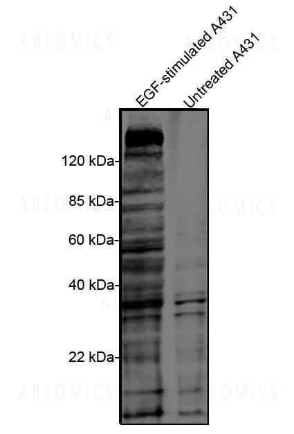 Figure-1 : Western blot analysis of Phosphotyrosine Antibody (Clone: 5E10E1) on EGF-stimulated A431 cell lysates and untreated A431 cell lysates at 1 µg/ml. IRDye 800 Conjugated affinity Purified Goat Anti-Mouse IgG was used as secondary Antibody.