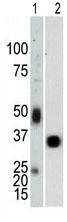 Figure 1: The monoclonal antibody anti-PTP1b (10-6612) is used in Western blot to detect PTP1b with Lane 1: mouse lung tissue lysate and Lane 2: recombinant protein PTP1b.