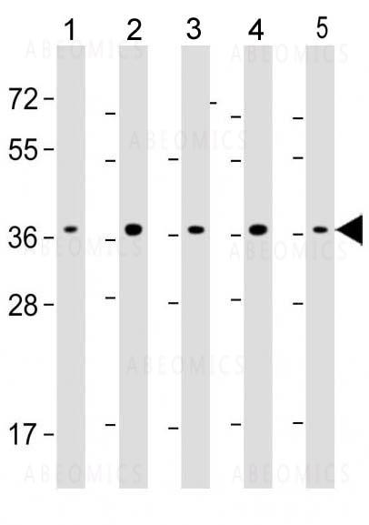 Figure 1: All lanes : Anti-RAD51 Antibody (10-6635) at 1:2000-1:4000 dilution with Lane 1: Hela whole cell lysate, Lane 2: Jurkat whole cell lysate, Lane 3: K562 whole cell lysate, Lane 4: A431 whole cell lysate, Lane 5: Ramos whole cell lysates/proteins at 20 µg per lane. Secondary Goat Anti-mouse IgG, (H+L), Peroxidase conjugated at 1/10000 dilution. Predicted band size : 37 kDa.