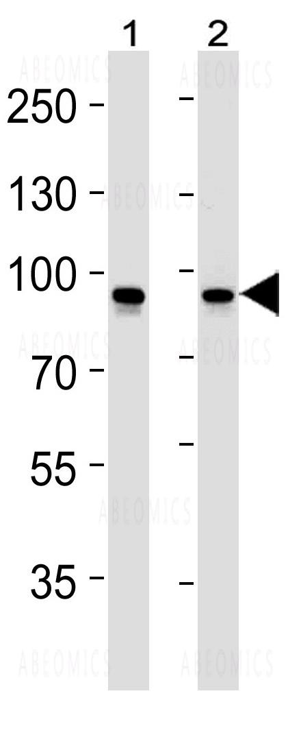 Figure 1: Western blot analysis of STAT1 Antibody (10-6602) with Lane 1: CEM, Lane 2: Hela cell line lysates (35μg/lane). This demonstrates the STAT1 antibody detected the STAT1 protein.