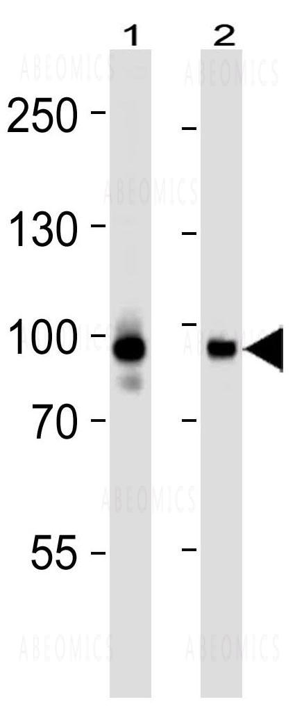Figure 1: Western blot analysis of Stat3 Antibody (10-6614) lysates with Lane 1: CEM, Lane 2: Hela cell line. Stat3 Antibody was diluted at 1:1000 at each lane. A goat anti-mouse IgG H&L (HRP) at 1:3000 dilution was used as the secondary antibody. Lysates at 35μg per lane.