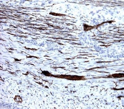Figure-1: Appendix section has been stained using Synaptophysin antibody (Clone: BS15) with 1:300 dilution. Ganglion cells and neuronal axons stained strongly.