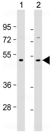 Figure 1: All lanes : Anti-TGFB2 Antibody (10-6551) at 1:500-1:1000 dilution with Lane 1: 293 whole cell lysate and Lane 2: K562 whole cell lysates/proteins at 20 µg per lane. Secondary Goat Anti-mouse IgG, (H+L), Peroxidase conjugated at 1/10000 dilution. Predicted band size : 48 kDa.