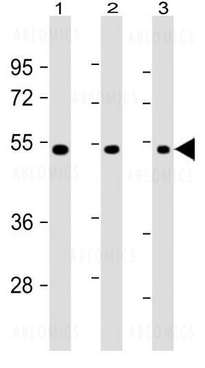 Figure 1: All lanes : Anti-VEGF3 Antibody (10-6511) at 1:2000 dilution with Lane 1: human ovary lysate, Lane 2: human testis lysate, Lane 3: mouse heart lysates/proteins at 20 µg per lane. Secondary Goat Anti-mouse IgG, (H+L), Peroxidase conjugated at 1/10000 dilution. Predicted band size : 47 kDa.