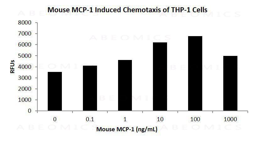 Biological Activity was determined by THP-1 chemotaxis at <=100 ng/mL . Centrifuge vial before opening, Suspend the product by gently pipetting the above recommended solution down the sides of the vial. DO NOT VORTEX. Allow several minutes for complete reconstitution. For prolonged storage, dilute to working aliquots in a 0.1% BSA solution, store at -80°C and avoid repeat freeze thaws. Upon reconstitution, a small amount of visible precipitate can be expected. A 10% overfill has been added to the total material vialed to compensate for this loss.