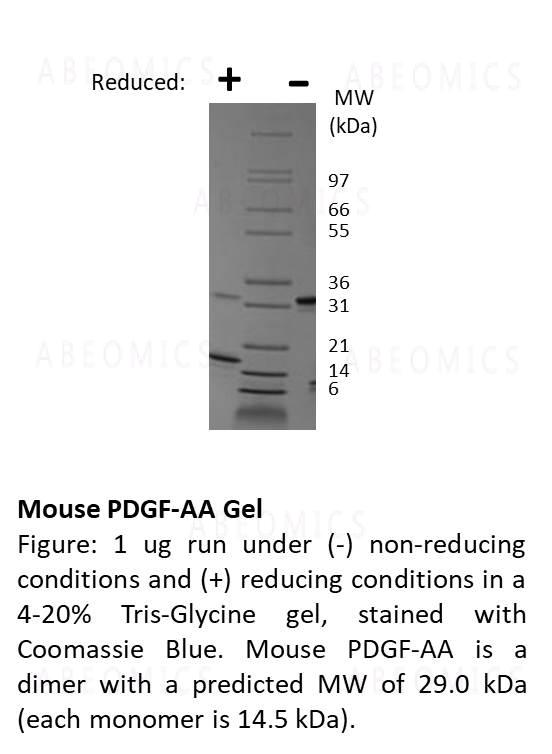 Platelet-derived growth factor (PDGF) is an important regulator of cell growth, proliferation, and angiogenesis. PDGF synthesis is induced by IL-1, IL-6, TNF-alpha, TGF-beta and EGF signaling. PDGF functions as a mitogenic growth hormone on cells of mesenchymal lineage, such as smooth muscle and glial cells. PDGF is also stored in the alpha-granules of platelets and is released upon adherence to traumatized tissues. PDGF is a dimeric glycoprotein formed by two A chains (AA), two B chains (BB), or as a heterodimer with an A and a B chain (AB). The PDGF dimer binds the cell surface receptor tyrosine kinases PDGFR-alpha and PDGFR-beta .