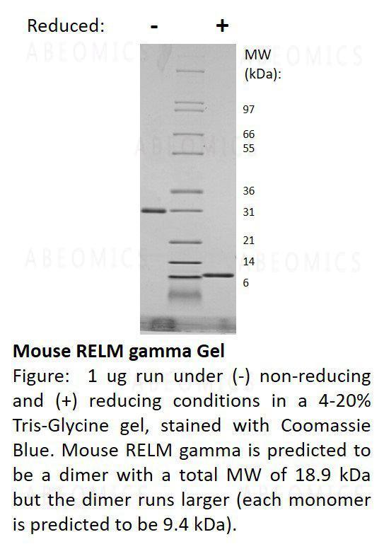 Resistin-like molecule-gamma (RELM-gamma ) is a member of the RELM family of secreted proteins containing C-terminal cysteines. The RELM family consists of Resistin (FIZZ3), RELM-alpha (FIZZ1), RELM-beta (FIZZ2), and RELM-gamma (FIZZ4). RELM-gamma is secreted by peripheral blood granulocytes, bone marrow, spleen, intestine, and lung. RELM-gamma functions to promote and regulate promyelocytic differentiation, in addition to regulating nutrient-associated insulin sensitivity in the intestinal tract. Rodents secrete all four RELM family members, whereas Resistin and RELM-beta are the only RELM family members found in humans.