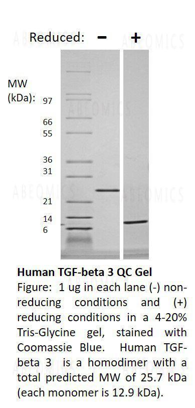 Transforming growth factors (TGFs) are multifunctional peptides that regulate growth and differentiation in most cell types. The TGF-beta family of proteins signal through serine/threonine kinase receptors. TGF-beta isoforms (TGF-beta 1, -beta 2, and –beta 3) have overlapping, yet distinct biological actions in developing and adult tissues. TGF-beta 3 is an important factor in regulating cell adhesion and accelerating wound repair. TGF-beta 3 also functions during osteoblast proliferation, chemotaxis, and collagen synthesis.