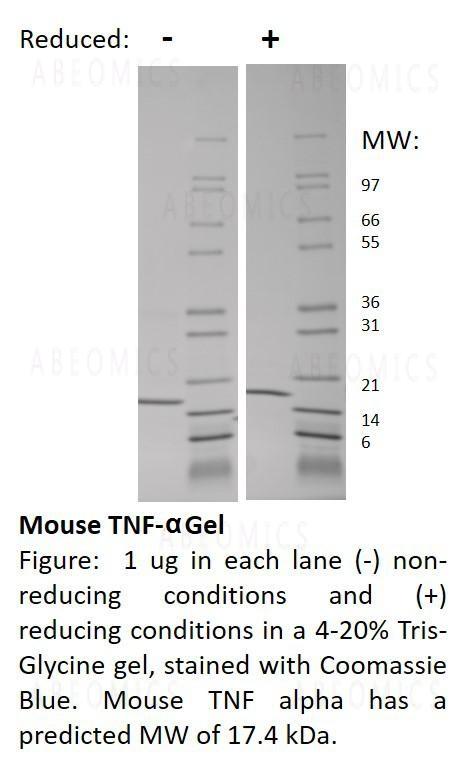 Biological Activity was determined by Cytolysis of mouse L929 cells in the presence of Actinomycin D at <=100 pg/mL; >= 1.0 x 10^7 units/mg (typcial ED50 is < 20 pg/mL). Centrifuge vial before opening, Suspend the product by gently pipetting the above recommended solution down the sides of the vial. DO NOT VORTEX. Allow several minutes for complete reconstitution. For prolonged storage, dilute to working aliquots in a 0.1% BSA solution, store at -80°C and avoid repeat freeze thaws. Upon reconstitution, a small amount of visible precipitate can be expected. A 10% overfill has been added to the total material vialed to compensate for this loss.