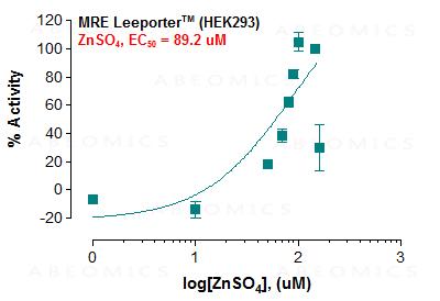 The MRE Leeporter™ Luciferase Reporter cell line is a stably transfected HEK 293 cell line which expresses Renilla luciferase reporter gene under the transcriptional control of the metal response element (MRE). MRE is targeted by MRE-binding transcription factor-1 (MTF-1) which is a zinc finger transcription factor and plays a major role in induction of metallothionein gene expression in response to cellular stress caused by heavy metals such as zinc and cadmium. The MRE induction by ZnSO4 is shown in Figure 1.