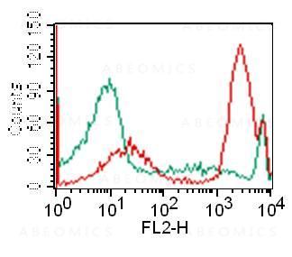 Fig-1: Cell Surface flow analysis of hCD3 in PBMC (Lymphocytes gated) using 0.1 µg/10^6 cells. Green represents isotype control (ABEOMICS); red represents anti-hCD3 antibody (10-4089). Goat anti-mouse PE conjugated secondary antibody was used (ABEOMICS).