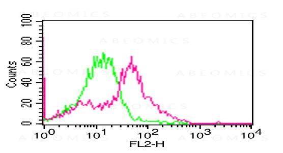 Fig-1: Cell Surface flow analysis of PD-L1 in 3 day-PHA treated human PBMC cells using 1 µg/10^6 cells of PD-L1 antibody (Clone: ABM5F25). Green represents isotype control; red represents anti-PD-L1 antibody. Goat anti-mouse PE conjugate was used as secondary antibody.