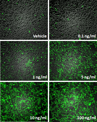 Fig-1: Induction of NF-kB activity by TNF-alpha in NF-kB Leeporter™ GFP reporter-HEK293 cells was analyzed by fluorescence microscopy. TNF-alpha was treated at 0.1, 1, 5, 10 and 100 ng/ml as noted.