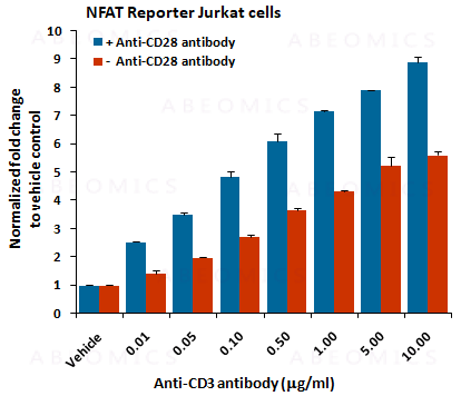 Fig-1: Induction of NFAT activity by anti-CD3 antibody in the presence or absence of anti-CD28 antibody at 10 ug/ml in NFAT Leeporter™ - Jurkat T cells.