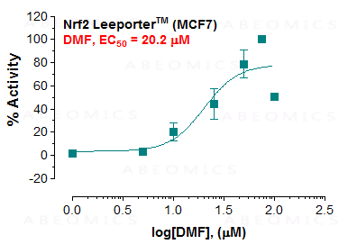 The Nrf2 Leeporter™ Luciferase Reporter cell line is a stably transfected MCF7 cell line which expresses Renilla luciferase reporter gene under the transcriptional control of the antioxidant response element (ARE). ARE is known to regulate expression and induction of various detoxifying enzyme genes in response to antioxidants and xenobiotics, and is primarily regulated by the Keap1-Nrf2 pathway in which induction and nuclear translocation of Nrf2 mediated by antioxidants and xenobiotics results in the binding of Nrf2 to ARE leading to the expression of defensive genes. The Nrf2 induction by dimethyl fumarate (DMF) is shown in Figure 1.
