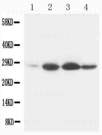 Figure 1: Anti-Bcl-2 monoclonal antibody(39-1004). Western blotting: Lane 1: Rat Heart Tissue Lysate , Lane 2: Rat Spleen Tissue Lysate , Lane 3: Rat Small Intestine Tissue Lysate , Lane 4: Rat Liver Tissue Lysate.