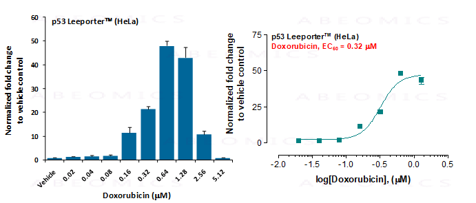 The p53 Leeporter™ Luciferase Reporter cell line is a stably transfected HeLa cell line which expresses Renilla luciferase reporter gene under the transcriptional control of the p53 response element. p53 is a tumor suppressor that plays a crucial role in apoptosis and anticancer mechanisms. p53 reporter system is designed to monitor the p53-mediated signaling pathways.The p53 induction by doxorubicin is shown in Figure 1.