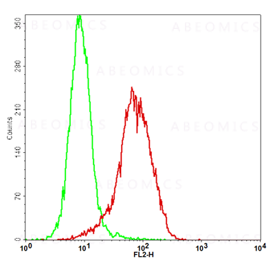 Fig-1: Detection of human PD-L1 in the CHO-K1/PD-L1 stable cell line by Flow Cytometry [Cell surface staining]. CHO-K1 cells (Green); CHO-K1/PD-L1 cells (Red).