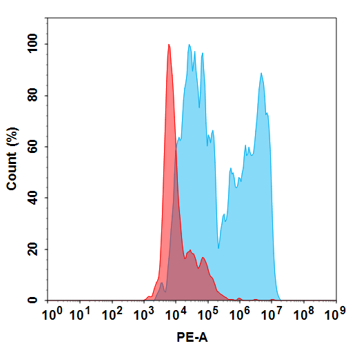 Figure 1. Flow cytometry analysis with 100 μl/test (1:400) PE-conjugated Anti-ENPP3 mAb on HEK293 cells transfected with human ENPP3 (Blue histogram) or HEK293 cells(Red histogram).