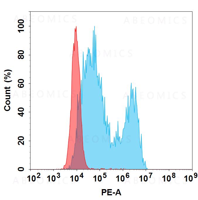 Figure 1. Flow cytometry analysis with 100 μl/test (1:400) PE-conjugated Anti-HER3 (patritumab biosimilar)mAb on HEK293 cells transfected with human HER3 (Blue histogram) or HEK293 cells(Red histogram).