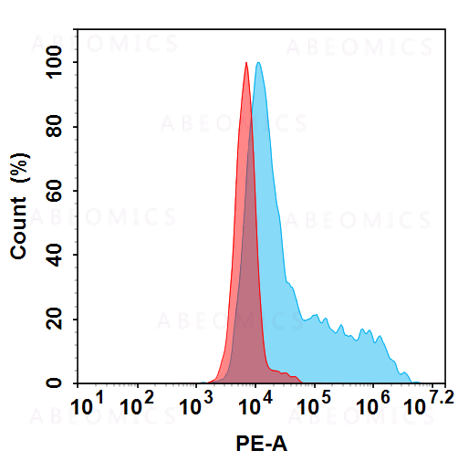 Figure 1. Flow cytometry analysis with 100 μl/test (1:400) PE-conjugated Anti-STEAP1(xaluritamig without CD3 biosimilar) mAb on HEK293 cells transfected with Human STEAP1 protein (Blue histogram) or HEK293 transfected with irrelevant protein (Red histogram).