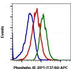 4E-BP1 regulates protein translations induced by upstream signals initiated by ERK1/2 MAP kinase or PI3-Kinase/AKT/mTOR pathways. Ultimately activation of mTOR, positively stimulates mRNA translation by its two dominant downstream substrates: ribosomal protein S6 kinase, and S6K1. Translation of mammalian mRNA is directed through cap dependent translation; the capping of 5' end of mRNA by m7-GTP that allows recruitment of eIF4F complex and the binding of 40S ribosomal subunit to the 5' mRNA cap. eIF4E is a heterotrimeric protein composed of the DEAD-box RNA helicase eIF4A, the cap binding eIF4E and the large scaffolding protein eIF4G. 4E-BP competes with eIF4G for binding to the same conserved patch of hydrophobic residues on the dorsal side of the eIF4E thus acting as a molecular mimic. Activated 4E-BP1 induces rapid cessation of cap dependent translation by binding to the translation factor eIF4E and preventing its interaction with eIF4G, thus inhibiting the pre-initiation complex formation. 4E-BP1 activity is regulation by multiple post-translational modification. Seven phosphorylation residues have been discovered in human 4E-BP1 including Thr37, Thr46, Ser56, Thr70, Ser83, Ser101, and Ser112. 4E-BP1 phosphorylation is up-regulated by extracellular stimuli, including serum, hormones, cytokines, and G-protein coupled receptor agonists while starvation for essential nutrients, growth factor deprivation, ischemia, hypoxia, and ethanol toxicity, strenuous exercise, exposure to glucocorticoids, and infection. Phosphorylation of 4E-BP1 regulates 4E-BP1 binding and downstream regulation. Binding of 4E-BP1 to proteins containing 4E containing domains reduce translation of specific mRNAs which include prosurvival factor Mcl-1, cell cycle regulator Cyclin D3, pro-angiogenic growth factor VEGF among others. In addition, 4E-BP competes with eIF4G proteins for a common binding site on the cap-binding protein, eIF4E. 4E-BP1 binding to eIF4E is highly modulated by the degree of 4E-BP1 phosphorylation. Hyperphosphorylation of 4E-BP1 by various extracellular stimuli activates decreases its affinity to eIF4E and hence eIF4E release. In turn eIF4E has an opportunity to bind to eIF4G forming function eIF4F complex. On the other hand, hypo-phosphorylation of 4E-BP1 increases 4E-BP1 affinity for eIF4E, inhibiting eIF4F formation.