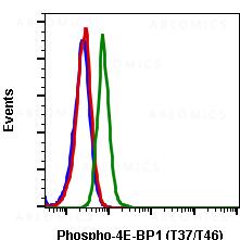 4E-BP1 regulates protein translations induced by upstream signals initiated by ERK1/2 MAP kinase or PI3-Kinase/AKT/mTOR pathways. Ultimately activation of mTOR, positively stimulates mRNA translation by its two dominant downstream substrates: ribosomal protein S6 kinase, and S6K1. Translation of mammalian mRNA is directed through cap dependent translation; the capping of 5' end of mRNA by m7-GTP that allows recruitment of eIF4F complex and the binding of 40S ribosomal subunit to the 5' mRNA cap. eIF4E is a heterotrimeric protein composed of the DEAD-box RNA helicase eIF4A, the cap binding eIF4E and the large scaffolding protein eIF4G. 4E-BP competes with eIF4G for binding to the same conserved patch of hydrophobic residues on the dorsal side of the eIF4E thus acting as a molecular mimic. Activated 4E-BP1 induces rapid cessation of cap dependent translation by binding to the translation factor eIF4E and preventing its interaction with eIF4G, thus inhibiting the pre-initiation complex formation. 4E-BP1 activity is regulation by multiple post-translational modification. Seven phosphorylation residues have been discovered in human 4E-BP1 including Thr37, Thr46, Ser56, Thr70, Ser83, Ser101, and Ser112. 4E-BP1 phosphorylation is up-regulated by extracellular stimuli, including serum, hormones, cytokines, and G-protein coupled receptor agonists while starvation for essential nutrients, growth factor deprivation, ischemia, hypoxia, and ethanol toxicity, strenuous exercise, exposure to glucocorticoids, and infection. Phosphorylation of 4E-BP1 regulates 4E-BP1 binding and downstream regulation. Binding of 4E-BP1 to proteins containing 4E containing domains reduce translation of specific mRNAs which include prosurvival factor Mcl-1, cell cycle regulator Cyclin D3, pro-angiogenic growth factor VEGF among others. In addition, 4E-BP competes with eIF4G proteins for a common binding site on the cap-binding protein, eIF4E. 4E-BP1 binding to eIF4E is highly modulated by the degree of 4E-BP1 phosphorylation. Hyperphosphorylation of 4E-BP1 by various extracellular stimuli activates decreases its affinity to eIF4E and hence eIF4E release. In turn eIF4E has an opportunity to bind to eIF4G forming function eIF4F complex. On the other hand, hypo-phosphorylation of 4E-BP1 increases 4E-BP1 affinity for eIF4E, inhibiting eIF4F formation.